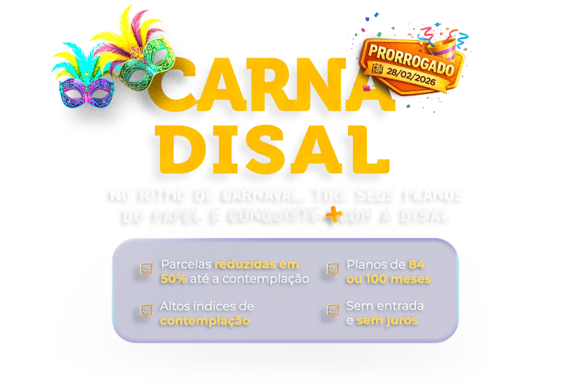 Veja todos os planosSimulações realizadas com o seguro de vida prestamista. Caso o cliente deseje contratar sem seguro, basta retirar a opção no momento do resumo da compra. Os créditos reduzidos possuem parcelas reduzidas até a contemplação. Na contemplação, o cliente poderá optar por permanecer com o crédito reduzido ou alterar para o crédito em 100%. Caso opte pelo crédito em 100%, as parcelas serão reajustadas, acrescendo a diferença. Os créditos referenciados possuem correção anual pelo IPCA. Administrado por Disal Adm. de Consórcios Ltda. Certif. de Autorização nº 03/00/057/89 – Central de Relacionamento 0800 703 0050. Ouvidoria: 0800 725 2289.